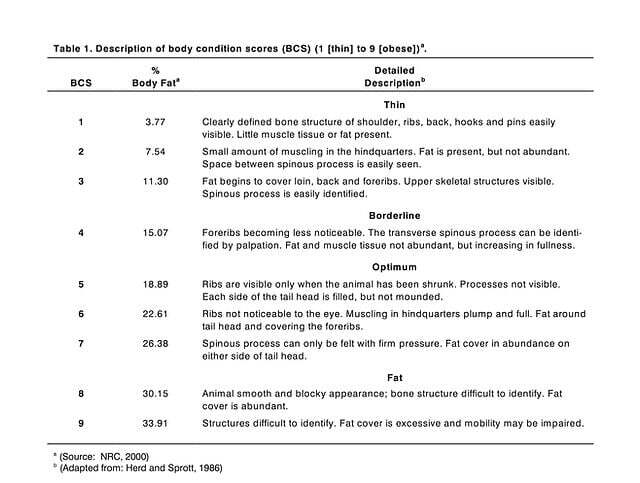 Body condition scoring (BCS) is a simple, cost-effective method to evaluate the fat reserves of a cow, typically measured on a scale of 1 (emaciated) to 9 (overweight). The ideal BCS for cows at calving is between 5 and 6. Cows in this range have shorter postpartum intervals, stronger calves at birth, better milk production, and higher pregnancy rates.
