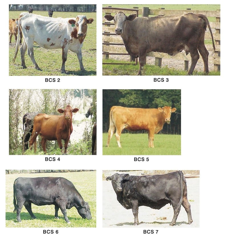 A side-by-side comparison of cows with BCS 2-7 to help you better visualize the scoring system